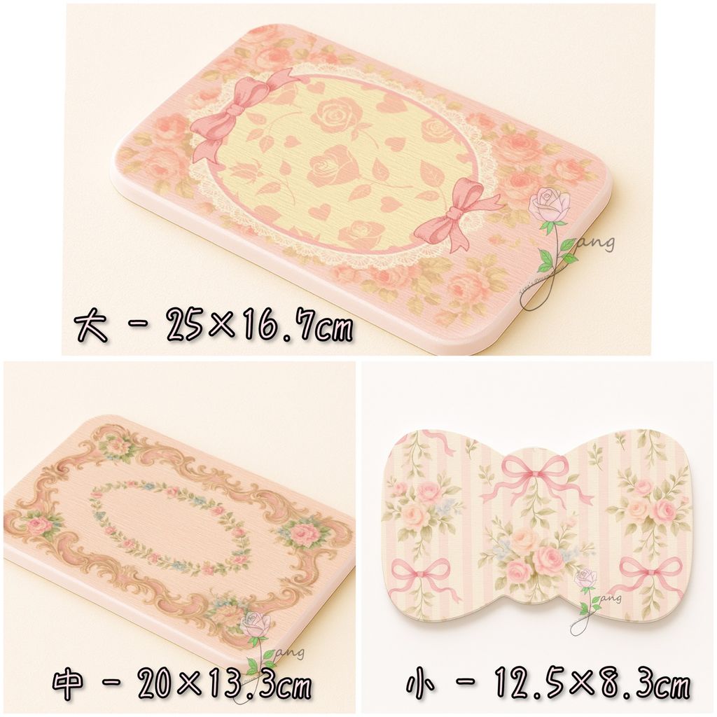 法式宮廷的精緻與浪漫,濃縮在這一片片實用又美麗的吸水墊上。全系列以柔美的粉色為基調,精心搭配了盛開的玫瑰、甜美的蝴蝶結以及華麗的古典飾框。每一款都宛如一件藝術品,為您的居家空間增添一抹雅致風情。可作為盥洗台旁的香皂墊、牙刷杯墊,告別濕漉漉的檯面。