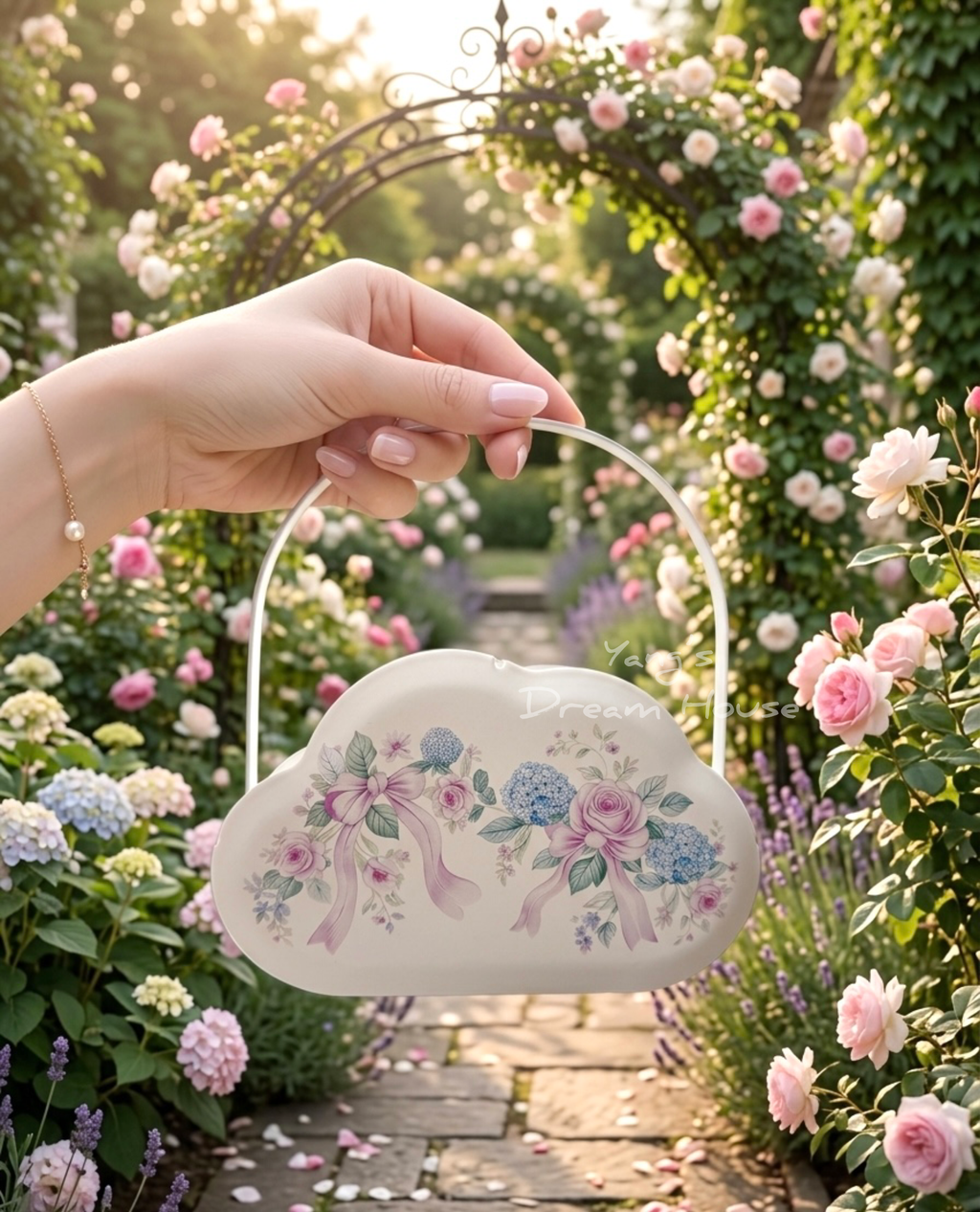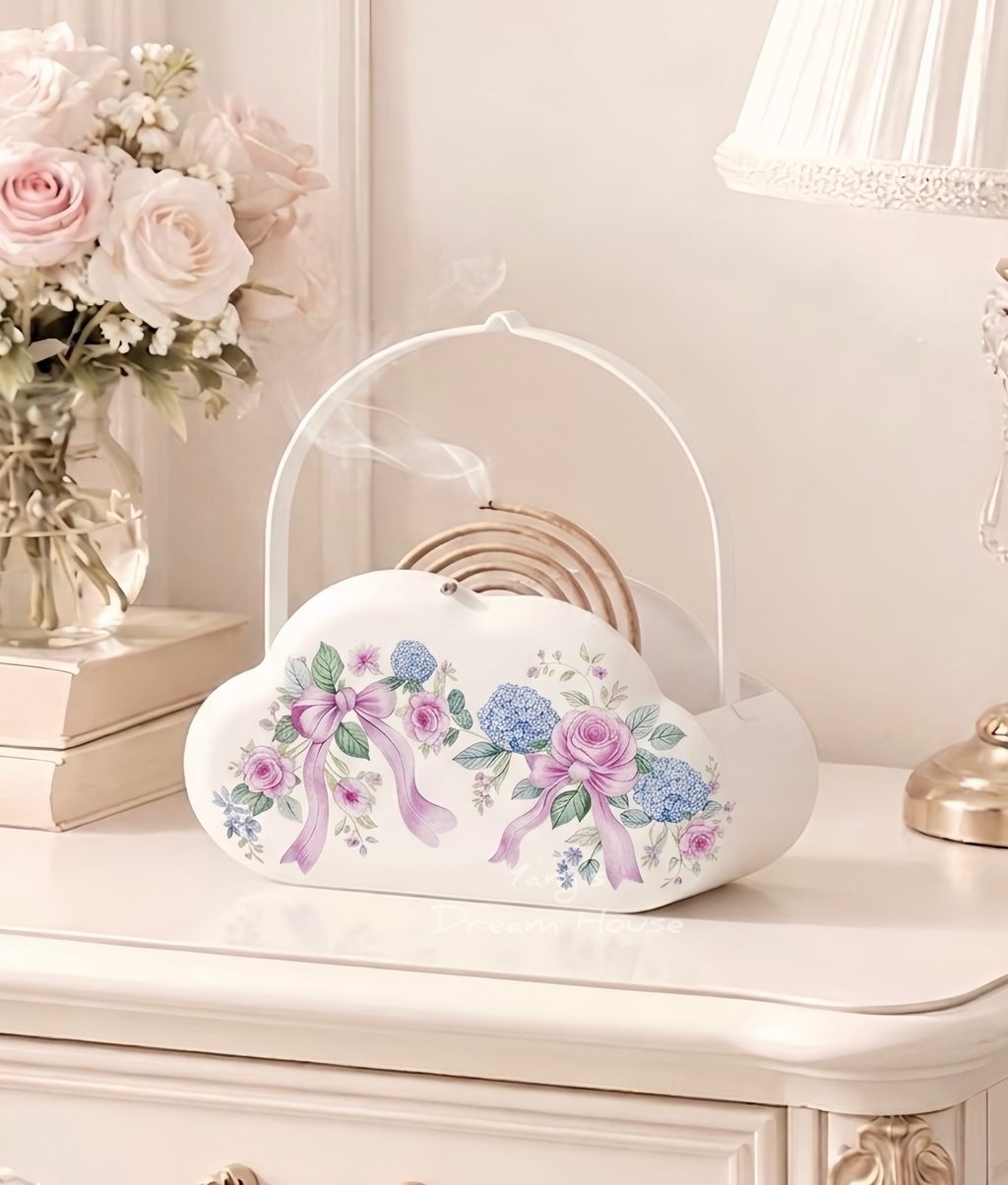 🌹浪漫鄉村風 玫瑰繡球花 雲朵造型鐵藝提把蚊香盒/花器